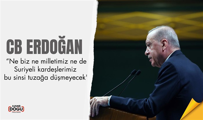 Türkiye’nin geçmişte yaşadığı sıkıntılara değinen Erdoğan, “Biz, sokaklar üzerinden kotarılan kaos planlarına bağışıklık kazanmış bir ülkeyiz. Geçmişte etki ajanları ve provokatörler eliyle ülkemize hangi bedellerin ödetildiğini gayet net hatırlıyoruz. Kayseri’de son derece iğrenç, rezil bir taciz vakası üzerinden aynı kaos planı tezgahlandı. Bu oyunun ikinci perdesi ise Suriye’nin kuzeyinde bulunan Türk çıkarlarına ve varlığına yönelik sahnelendi. Bölücü terör örgütü artıkları ve işbirlikçiler eliyle kotarılan bu oyunu kimin yazdığını, bunlara kimlerin figüranlık yaptığını çok çok iyi biliyoruz. Allah’ın izniyle ne biz, ne milletimiz, ne de Suriyeli kardeşlerimiz, bu sinsi tuzağa düşeceğiz. Nefret söylemlerine, faşizme, ırkçı vandallığa ve provokasyonlara boyun eğmeyeceğimizi burada tekrar altını çizerek söylemek istiyorum. Bayrağımıza uzanan mülevves elleri kırmasını bildiğimiz gibi, ülkemize sığınan mazlumlara uzanan elleri de kırmasını biliriz. Kimse; kendini polisin, hakimin, devletin yerine koyamaz. Kayseri’deki olaylar sonrasında ortalığı yakıp yıkan, polisimize saldıran, işyerlerine ve evlere zarar veren 474 provokatör göz altına alındı. Dün de Suriye Milli Ordusu güçleri ve güvenlik kuvvetlerimiz, Suriye’nin kuzeyindeki kışkırtmalara gerekli müdahalelerde bulundu. Suriye Geçici Hükümeti ise şanlı bayrağımıza yönelik saldırıları lanetlediğini en sert biçimde kamuoyuna ilan etmiştir. Fitne teşebbüsleri bir kez daha boşa çıkmıştır. İstihbarat birimlerimiz, sınırın öte tarafındaki ortaklarıyla birlikte çok titiz bir çalışma yürütmektedir. Hangi kirli ellerin bu işlerin arkasında olduğunu mutlaka ortaya çıkaracağız. Şunun bir defa idrak edilmesi şarttır: Türkiye’nin Suriye’deki mevcudiyeti ‘teröristan’ kurma planlarının önündeki en büyük bariyerdir. Çok iyi biliyoruz ki; “böl-parçala-yönet” anlayışıyla coğrafyamızı lime lime eden emperyalistler bundan rahatsızdır. Onları rahatsız etmeyi sürdüreceğiz. Silahlarının namlusu ülkemize çevrili eli kanlı caniler orada var oldukça; biz de ülkemizin ve milletimizin güvenliğini sağlamaya devam edeceğiz. Bölücü terör tehdidi tamamen ortadan kalkınca, elbette biz de üzerimize düşeni yaparız.Ama bırakın tehdidin boyutunun azalmasını, terör örgütü her gün yeni bir provokasyona girişirken, kimse bizden gelişmeleri tribünden seyretmemizi beklemesin” dedi.