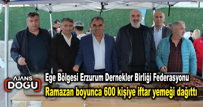 Ege Bölgesi Erzurum Dernekler Birliği Federasyonu Ramazan ayı boyunca 600 kişiye iftar yemeği dağıttı. Dernek başkanı Salmanoğlu, “Amacımız gurbette yaşayan Erzurumlu hemşerilerimizle yaşadığımız bölgelerde birlik içinde hem şehrinizin tanıtımını yapmak ve hem de faydalı işlerle insanlığa faydalı olmak.” dedi.