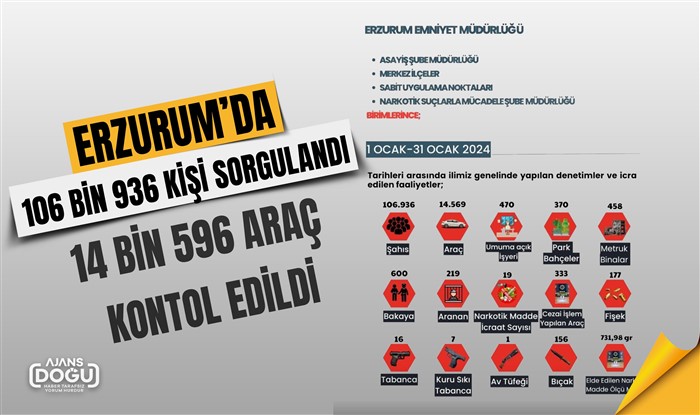 Erzurum Emniyeti Ocak 2024 dönemini kapsayan bir aylık zaman diliminde 106 bin 936 kişi ve 14 bin 596 araç üzerinde sorgulama yaptı.