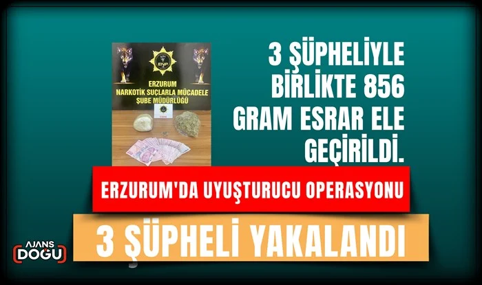 Erzurum Emniyet Müdürlüğü Narkotik Suçlarla Mücadele Şube Müdürlüğünce uyuşturucu madde ticareti ve sevkiyatına yönelik yapılan çalışmalarda, 3 şüpheliyle birlikte 856 gram esrar ele geçirildi.