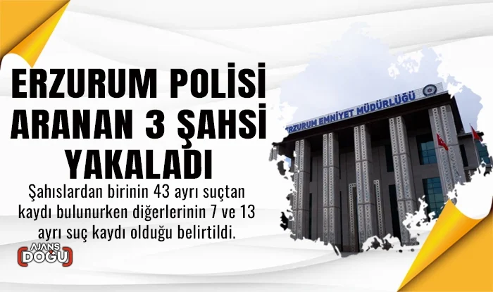 Erzurum Emniyet Müdürlüğü Asayiş Şubesi ekipleri çeşitli suçlardan aranan 3 şahsı yakaladı. Şahıslardan birinin 43 ayrı suçtan kaydı bulunurken diğerlerinin 7 ve 13 ayrı suç kaydı olduğu belirtildi.