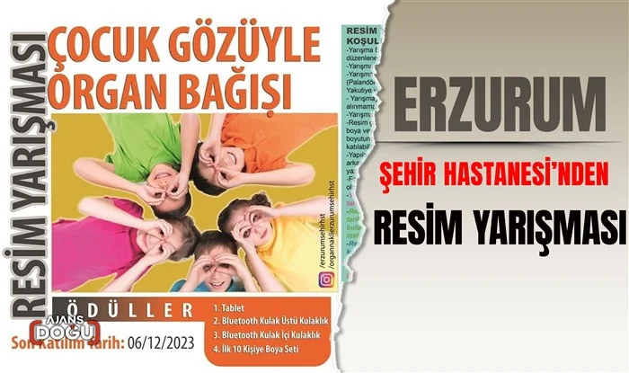 AJANS DOĞU – Erzurum Şehir Hastanesi tarafından düzenlenen resim yarışması katılım koşulları ise şu şekilde “ Yarışmaya Erzurum iline bağlı merkez ilçelerdeki (Palandöken, Yakutiye ve Aziziye) ortaokul öğrencileri katılabilir. Yarışmaya katılacak resimler başka eserlerden kopya alınmamalıdır. Yarışmaya her öğrenci 1(bir) resim ile katılabilir. Resim çizgi tekniği serbesttir. Kuru boya, pastel boya, sulu boya veya karakalem çalışması olabilir. Öğrenciler, 25X35 cm boyutunda, resim kağıdına yapılmış resimleriyle yarışmaya katılabilirler. Yapılan resimler renkli fon kağıdına yapıştırıldıktan sonra arkasına isim, soy isim, şube, sınıf, okul ve iletişim bilgileri yazılmalıdır. Fon kağıdının ebatları resim kağıdından 2 şer cm geniş olmalıdır. Yarışmaya son katılım tarihi 06.12.2023 olup, en geç bu tarihte okulun resim öğretmenine teslim edilmelidir. Resim öğretmenleri toplanan resimleri 07.12.2023 tarihinde, Erzurum Şehir Hastanesi E Blok 2. katta bulunan Organ ve Doku Nakli Koordinatörlüğüne, elden teslim etmelidir. Resimler 11-12 Aralık tarihlerinde organ organ nakli koordinatörleri ve jüri üyeleri tarafından değerlendirilecektir.” Açıklandı.