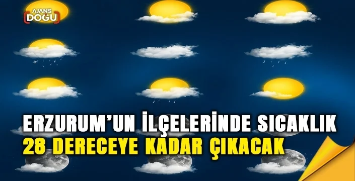 Erzurum merkezde en yüksek sıcaklık 24 derece olarak ölçülürken, ilçelerde sıcaklıklar 21 ile 28 derece arasında değişiyor. En yüksek sıcaklık 28 derece ile İspir, Oltu, Şenkaya, Uzundere ve Tortum’da bekleniyor.