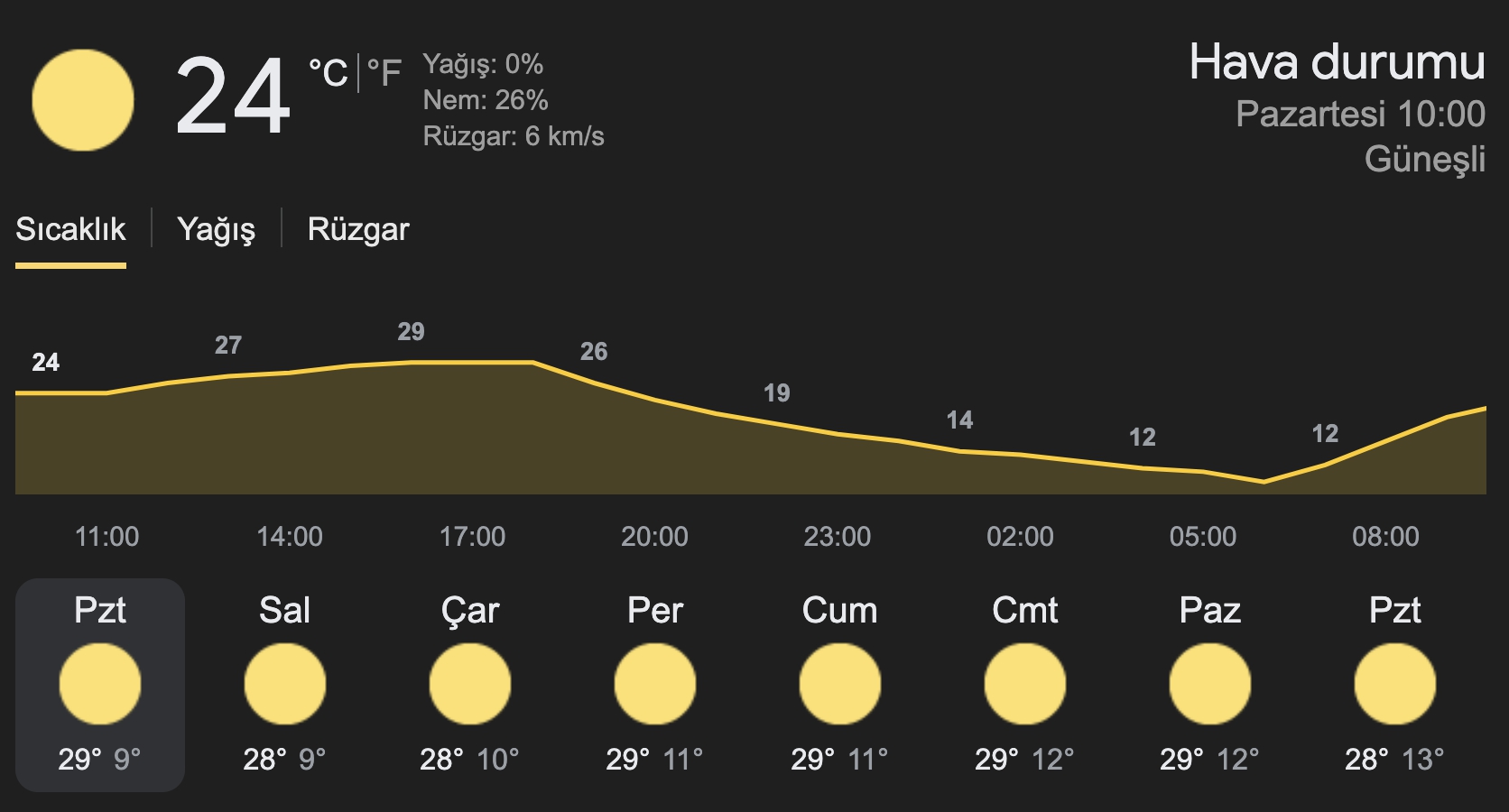 Erzurum merkezde en yüksek sıcaklık 30 derece olacak. İlçelerden Aşkale ve Aziziye’de sıcaklık 33 dereceye ulaşacak. Çat, Horasan, Hınıs, Köprüköy ve Narman’da 33-34 derece aralığında seyredecek. İspir, Karaçoban, Oltu ve Olur’da sıcaklık 35 dereceye çıkacak. Karayazı ve Palandöken’de 30 derece ölçülürken, Pasinler 33, Pazaryolu 35, Şenkaya ve Tekman 31, Tortum ve Uzundere ise 34 derece olacak. Yakutiye’de ise en yüksek sıcaklık 30 derece olarak tahmin ediliyor.