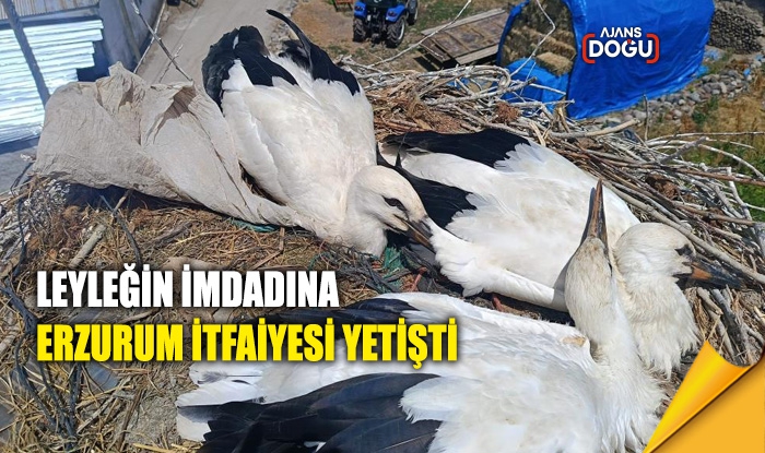 Erzurum’da boynuna poşet dolanan leyleği, itfaiye personeli gerekli müdahaleyi yaparak kurtardı.