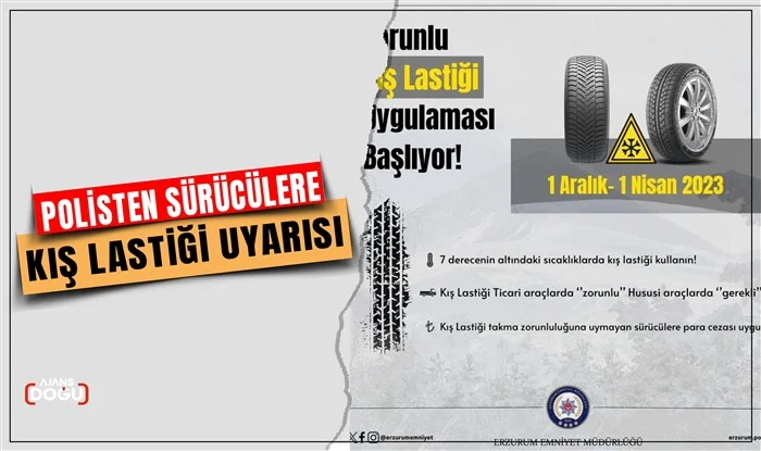 Erzurum Emniyet Müdürlüğü zorunlu kış lastiği uygulamasının 1 Aralık 2023’te başlayacağını açıkladı.