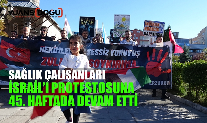 Erzurum’da görev yapan sağlık çalışanlarının İsrail’in Gazze’ye yönelik saldırılarının 45’inci haftasında da sesiz yürüyüşleriyle protestolarını sürdürdü.