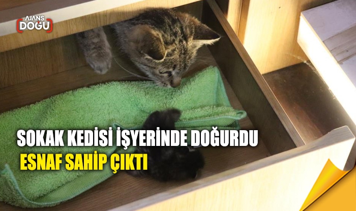 Erzurum’un Oltu ilçesinde bir sokak kedisi işyerinde çekmecede doğurdu, esnaf anne kedi ve yavruya sahip çıktı.